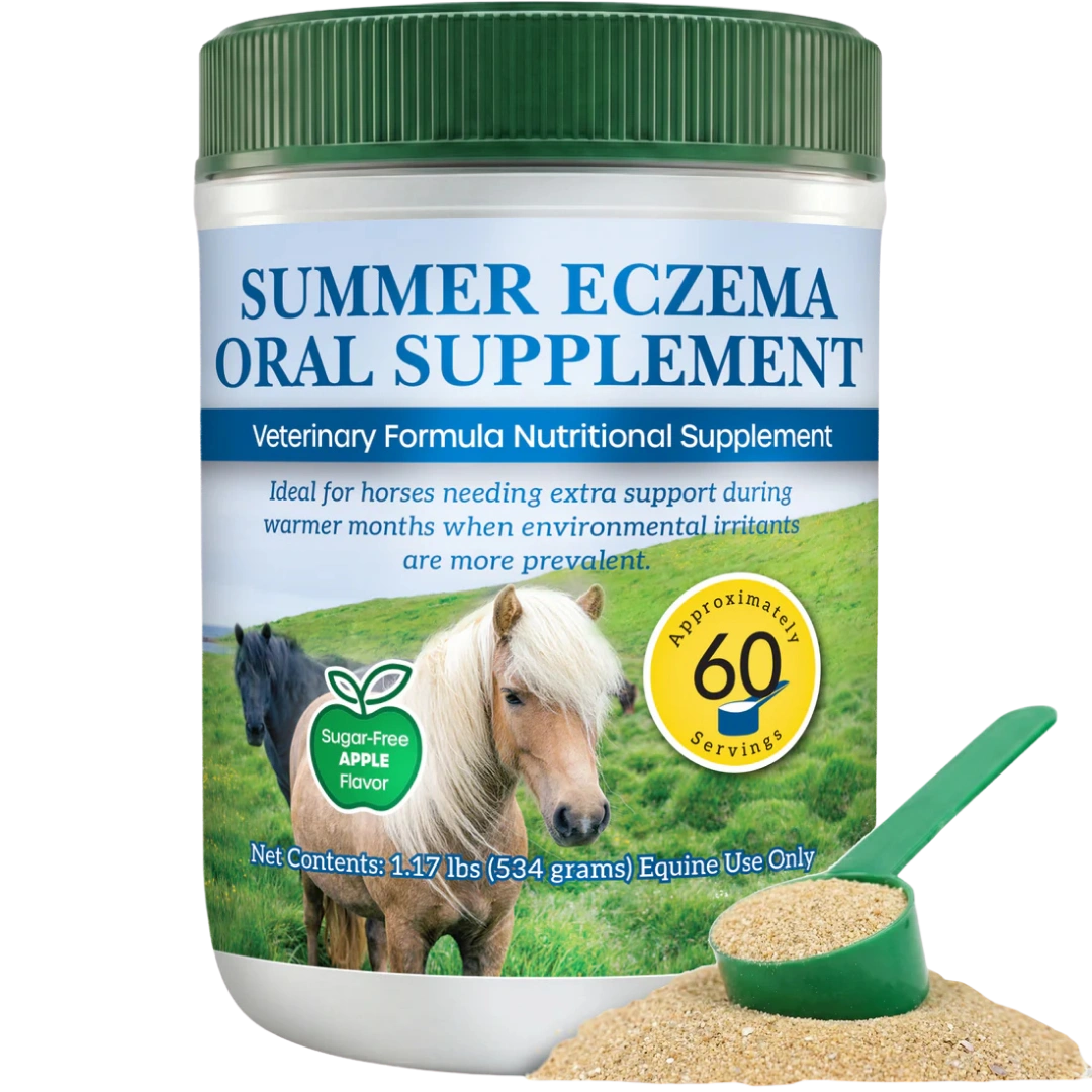 Summer Eczema is a natural oral supplement designed to support skin health and comfort in horses during seasonal challenges. It features a carefully selected blend of herbs formulated to help maintain normal immune response and soothe skin sensitivities in all breeds of horses. Seasonal skin issues may appear as hairless, reddened, crusted, or irritated areas, often seen on the base of the tail, mid-line of the belly, mane, or neck. This supplement includes herbs traditionally used to support skin wellness in response to environmental irritants. Thousands of servings have been used by horses across the United States with positive feedback from users.